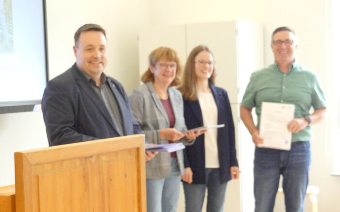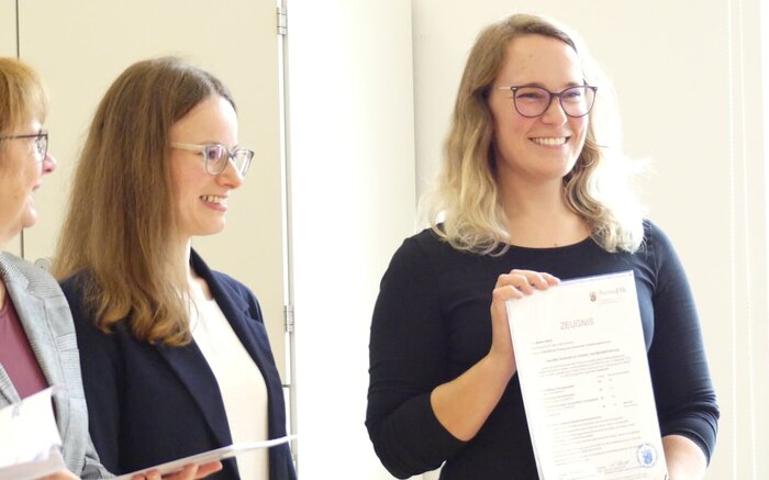 Silvia Licht für die zuständige Stelle beim Landesamt für Soziales, Jugend und Versorgung brachte die Zeugnisse und herzliche Glückwünsche mit. Außerdem gratulierten der Landesgeschäftsführer der Lebenshilfe, Sven Friedrich und die Kursleitung des gFAB-Kurses, Mareike Schlote.